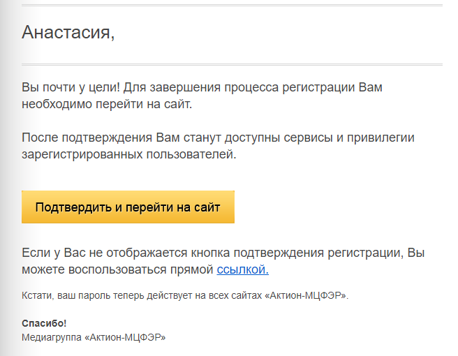В почте найдите письмо и перейдите по кнопке “Подтвердить и перейти на сайт”